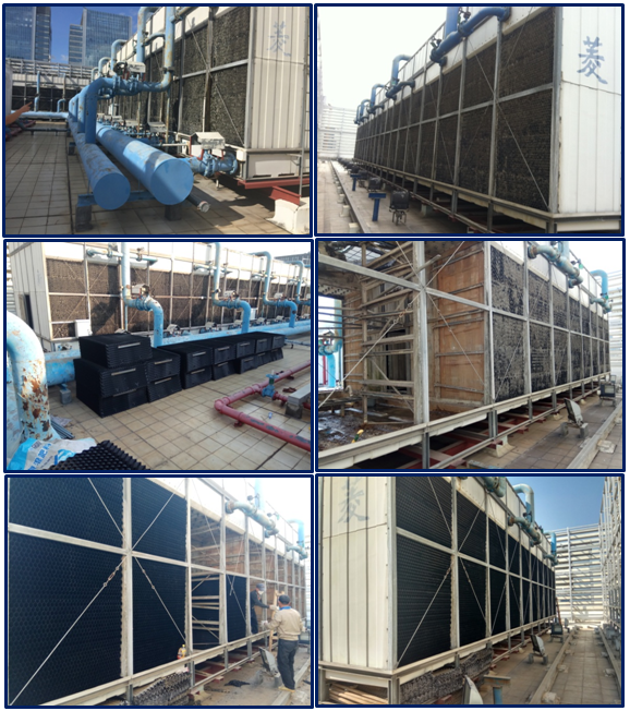 TCL總部大樓采購國內(nèi)知名品牌,冷卻塔總冷量為6000冷噸,原生產(chǎn)廠家已經(jīng)停止生產(chǎn)該款尺寸冷卻塔填料,管道多個部位均出現(xiàn)破裂漏水,我司排除專業(yè)技術團隊,在不停機狀況下完成整個升級改造,效果于新設備無異。