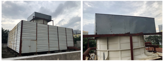 改造前為高轉(zhuǎn)速動力系統(tǒng),噪音大 出風(fēng)口被擋住,散熱效率差 冷卻塔接水盤破裂